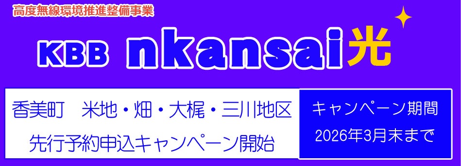 - 2025年11月20日 北関西ジャパンネットからのお知らせ 香美町における高度無線環境整備推進事業【KBB nkansai光】先行予約キャンペーン開始します。